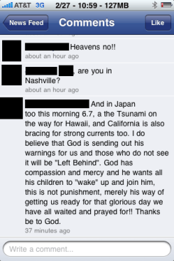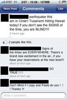 The people in the above Facebook exchange are talking about 2 types of things: Those that have already happened (Haiti, Japan, and Chile) and Things that are about to happen (Tsunami hitting Hawaii.) Talking about the past, even the resent past (Haiti, Chile, and Japan) does not make you prophet worthy. However, When you start saying that an “Act of God,” like a tsunami, will hit a specific location, you are claiming that you know God’s will and are stating it to the world. That my friends is claiming some sort of Divine inspiration or God sent fore knowledge of an event. That is the definition of a prophet and those, if my memory serves right, were few and far between.